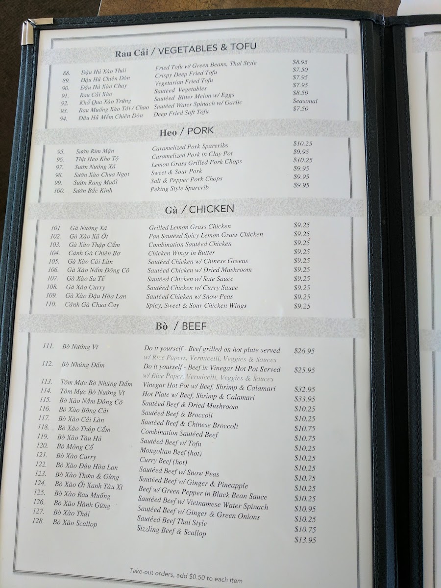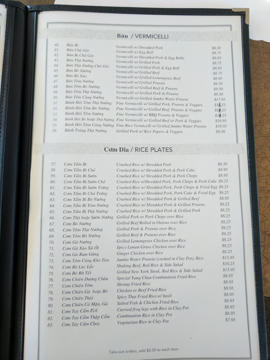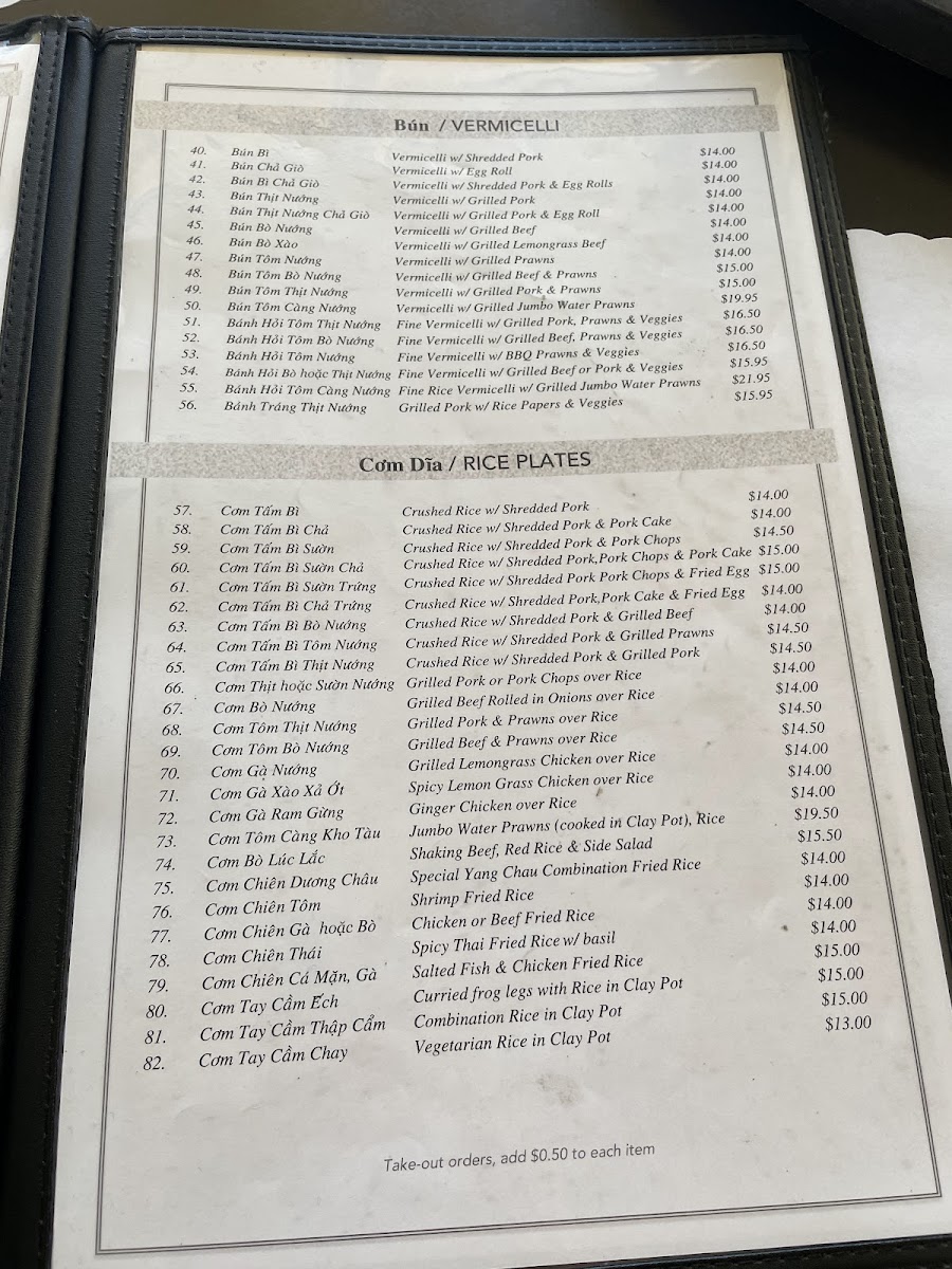 Main dishes highlight different types of rice and egg noodles, prepared in various regional styles that showcase the diversity of Vietnamese cuisine. Whether you're stopping by for a satisfying lunch or a relaxed dinner with friends and family, the menu supports a communal, family-style atmosphere where dishes are meant to be shared and enjoyed together.