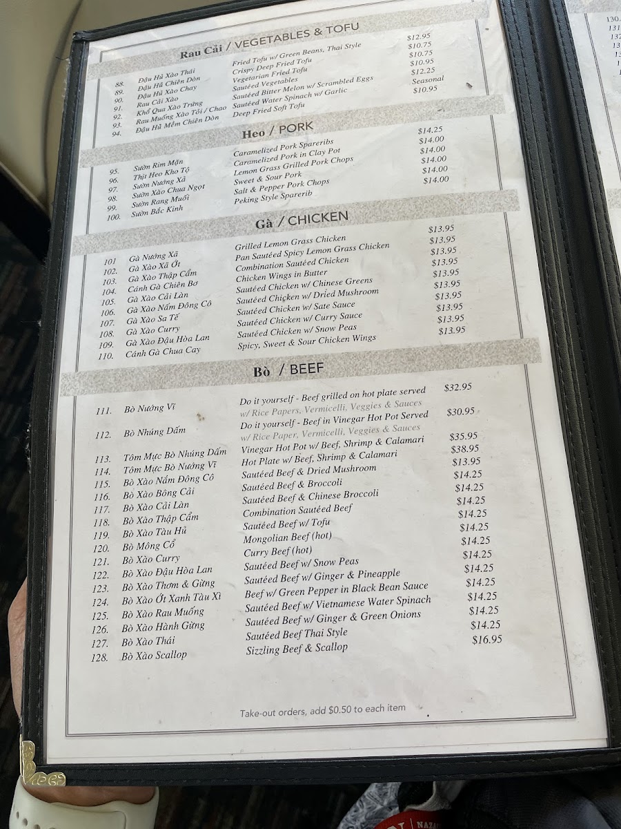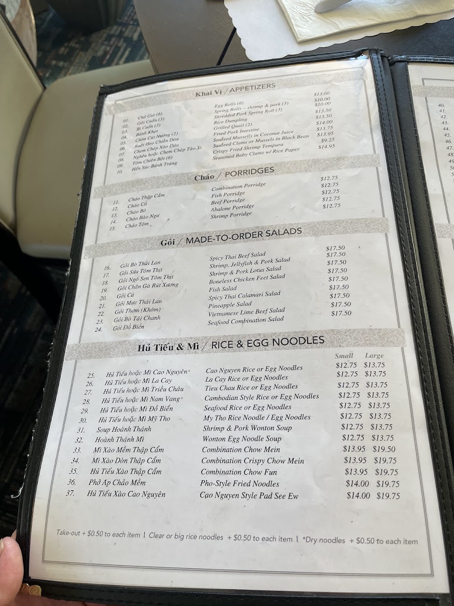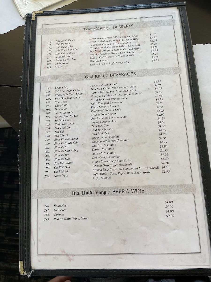 Main dishes highlight different types of rice and egg noodles, prepared in various regional styles that showcase the diversity of Vietnamese cuisine. Whether you're stopping by for a satisfying lunch or a relaxed dinner with friends and family, the menu supports a communal, family-style atmosphere where dishes are meant to be shared and enjoyed together.